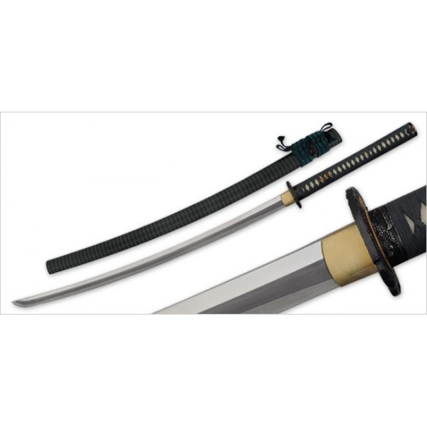 The Hunter Katana is built on the Hanwei L6/Bainite blade in the Shinogi Zukuri style, and featuring superb koshirae, the Hunter is a very desirable and functional piece. The subdued green silk ito and green striped lacquered saya compliment the blackened tsuba with golden accents, featuring a raptor stalking his next prey.